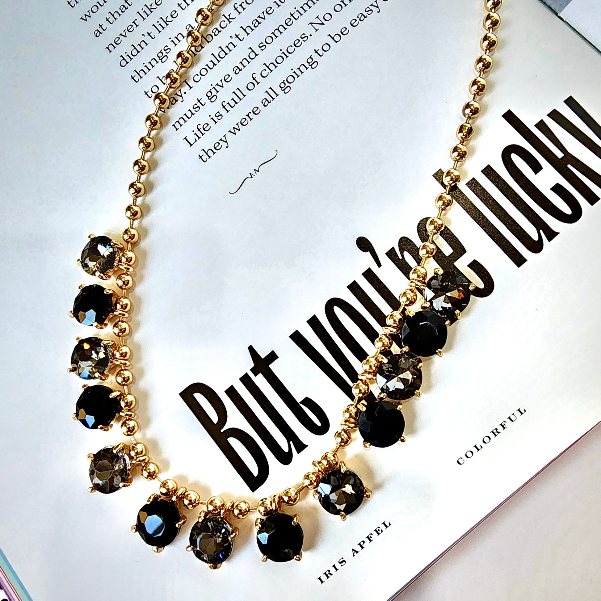 This gold beaded necklace is accented with a row of faceted crystals in deep black and smoky tones, creating a rich, dimensional contrast against the high-shine gold. Each stone is prong-set to catch subtle light, giving off a low, reflective glow rather than high sparkle—refined, not flashy.