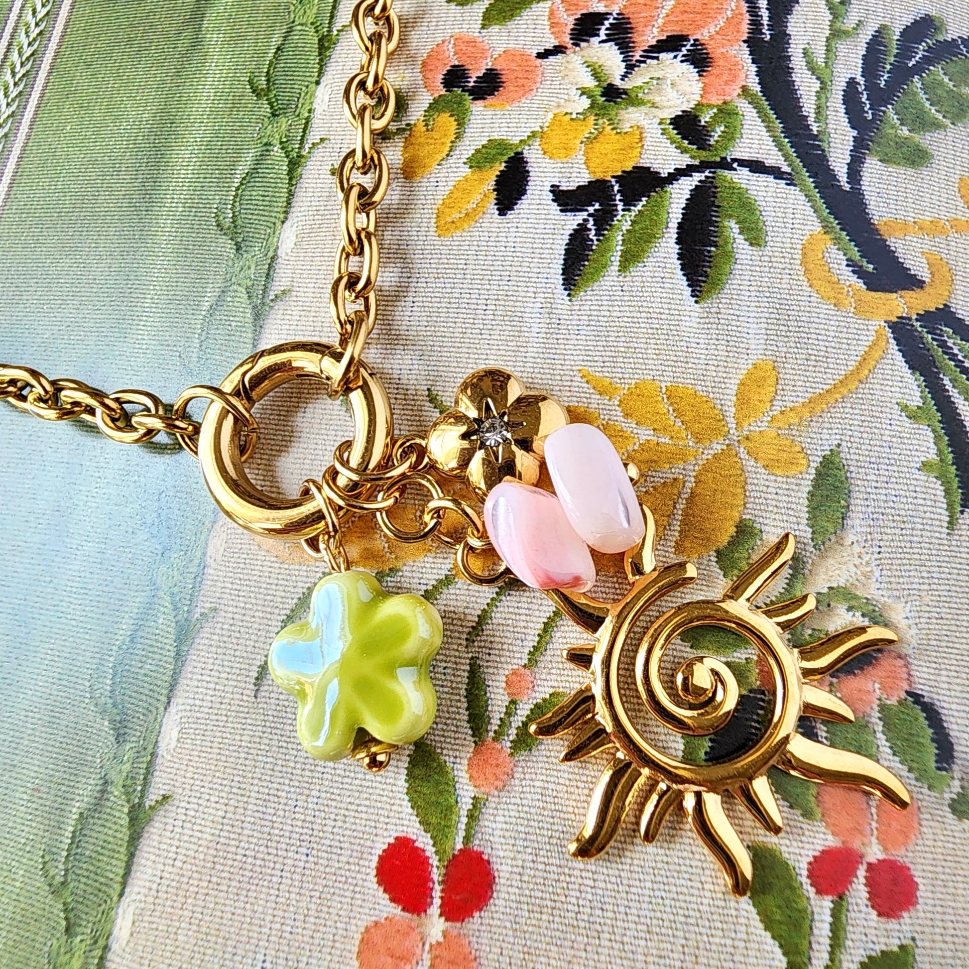 Mixed charm design: enamel florals, gold accent charm, and sun pendant