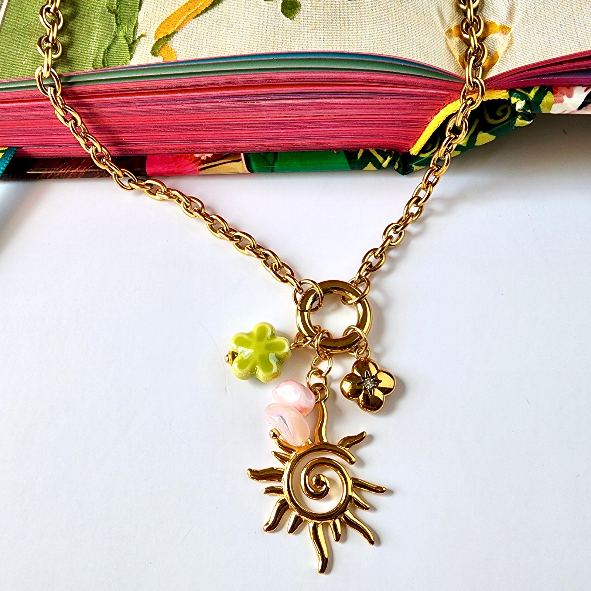 This gold chain necklace features a front toggle detail with a curated mix of delicate charms—soft enamel florals in fresh green and blush pink, a petite gold bloom, and a sculptural sun pendant with a spiral center. Each element brings its own texture and tone, creating a layered look that feels light, personal, and easy to wear.