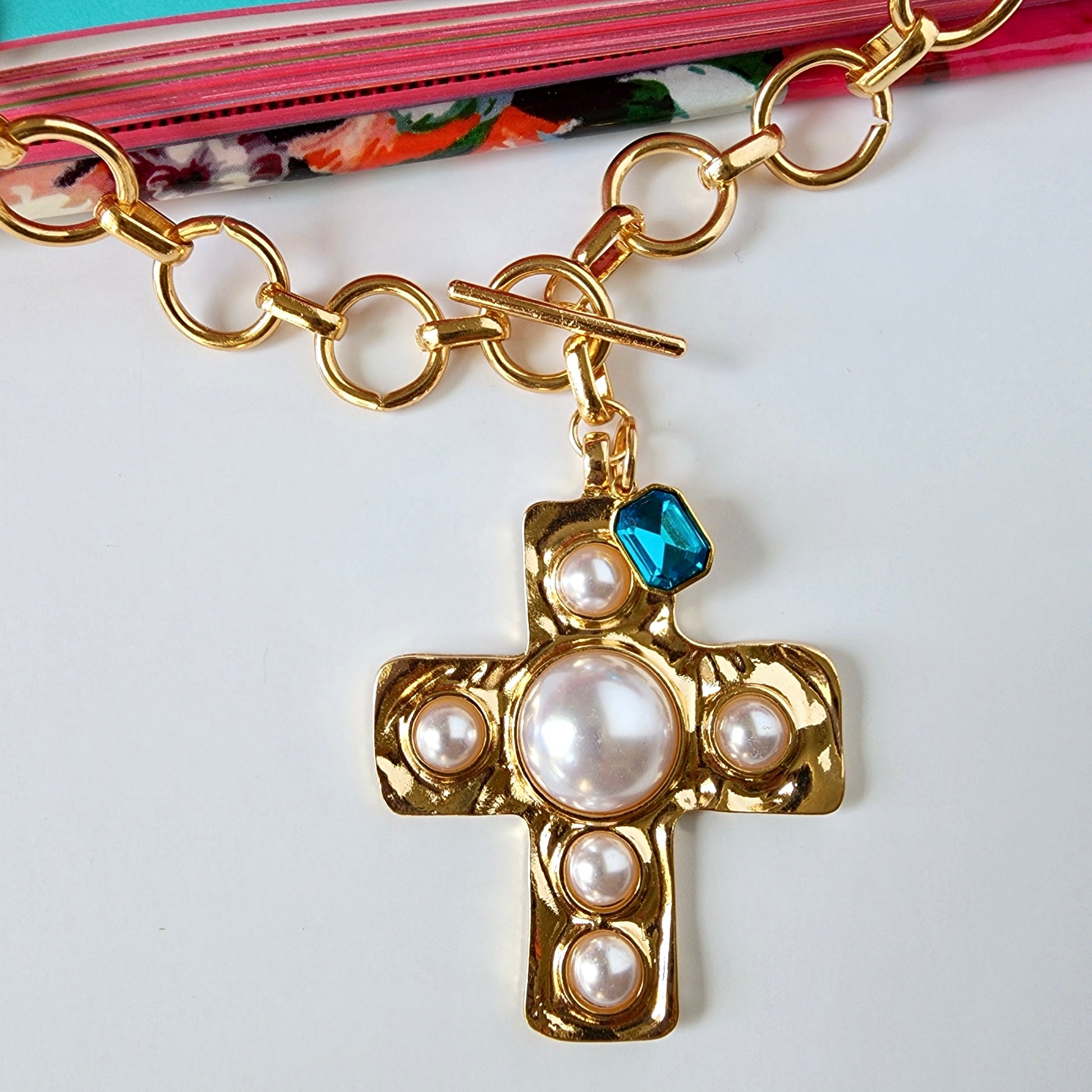 This statement necklace features a bold gold link chain finished with a front toggle closure, anchoring a sculptural cross pendant detailed with luminous pearl accents. At the top, a faceted azure crystal adds a sharp pop of color—clean, saturated, and intentional against the warmth of the gold.