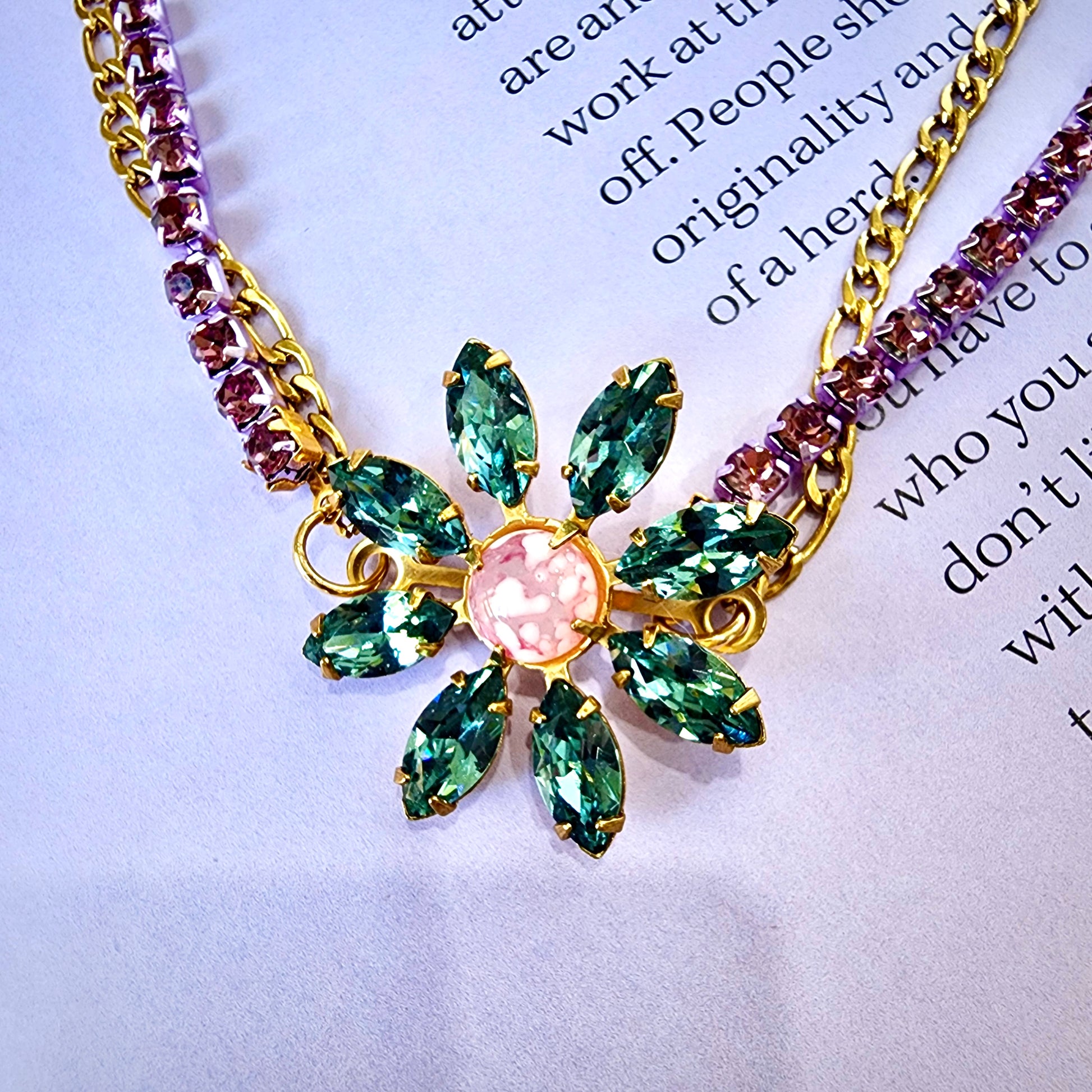 The Teal Bloom features marquise-cut crystals in a deep teal hue, arranged in a radiant floral silhouette and centered with a soft blush stone for contrast. Paired with a dual-chain design—polished gold PVD and a strand of delicate crystals—it creates a layered, dimensional look that feels both refined and striking.