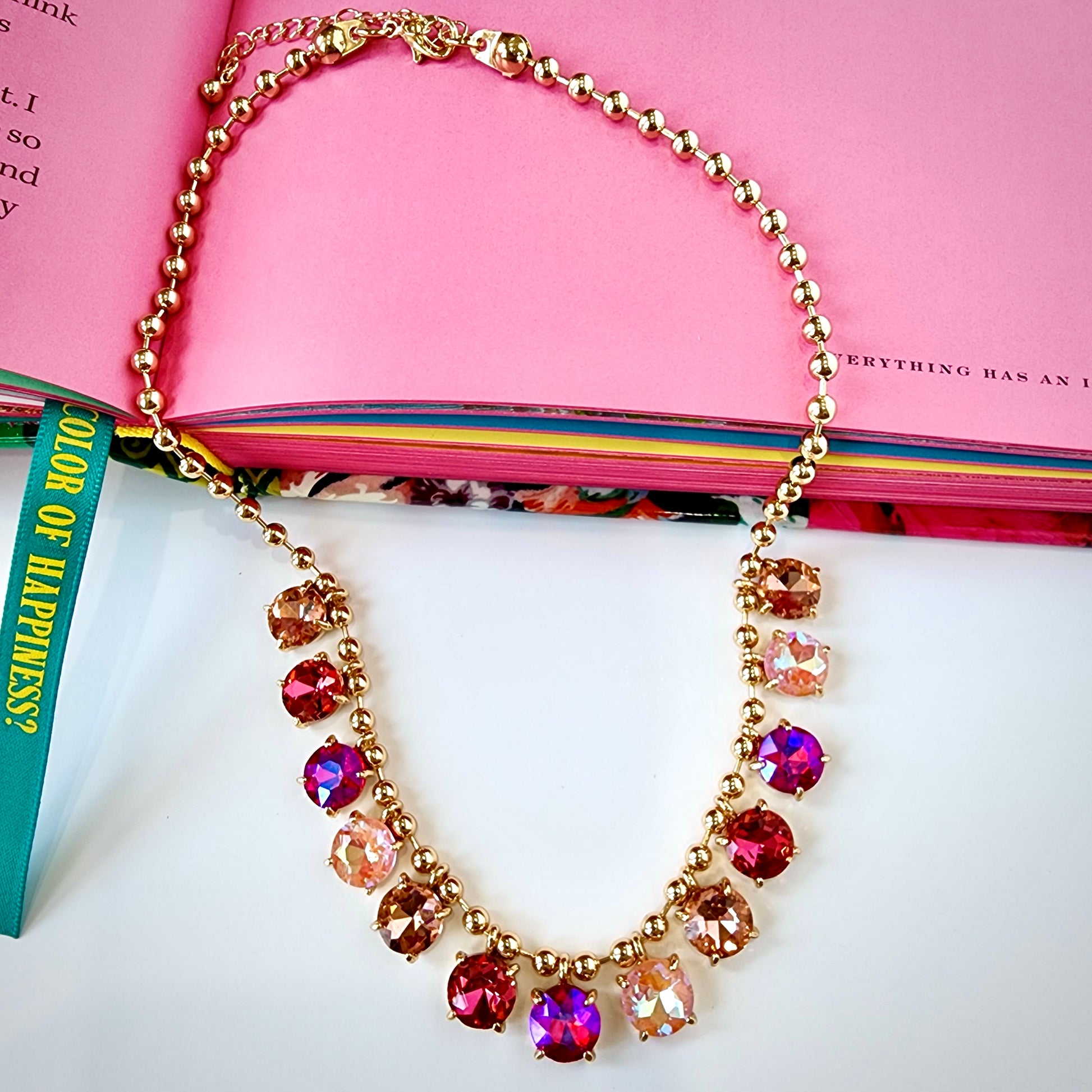 The Delray features a radiant mix of fiery reds, fuchsia, and soft champagne crystals, each one catching the light with a rich, glowing intensity. Set along a polished gold beaded chain, the alternating tones create depth, movement, and that unmistakable golden-hour shine.