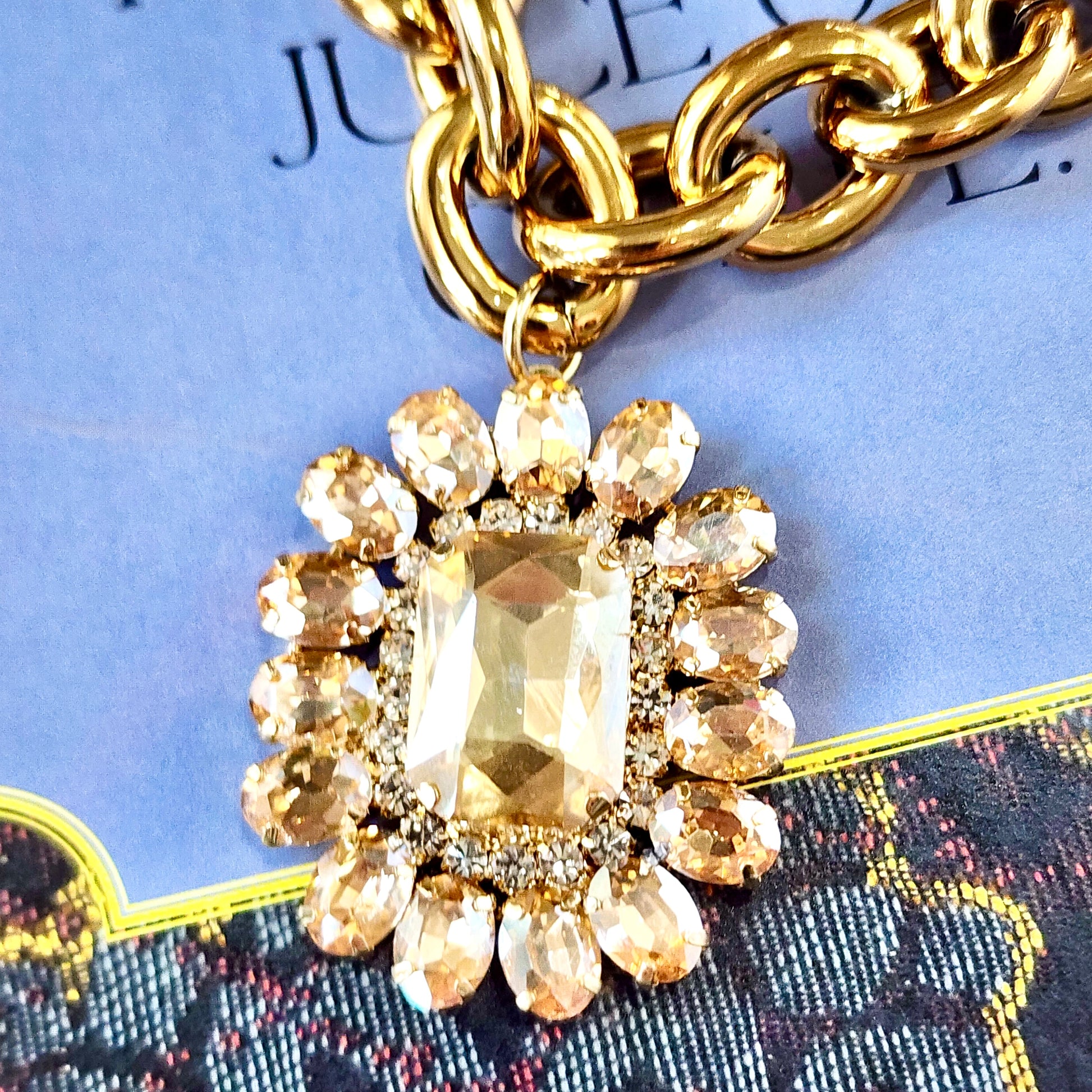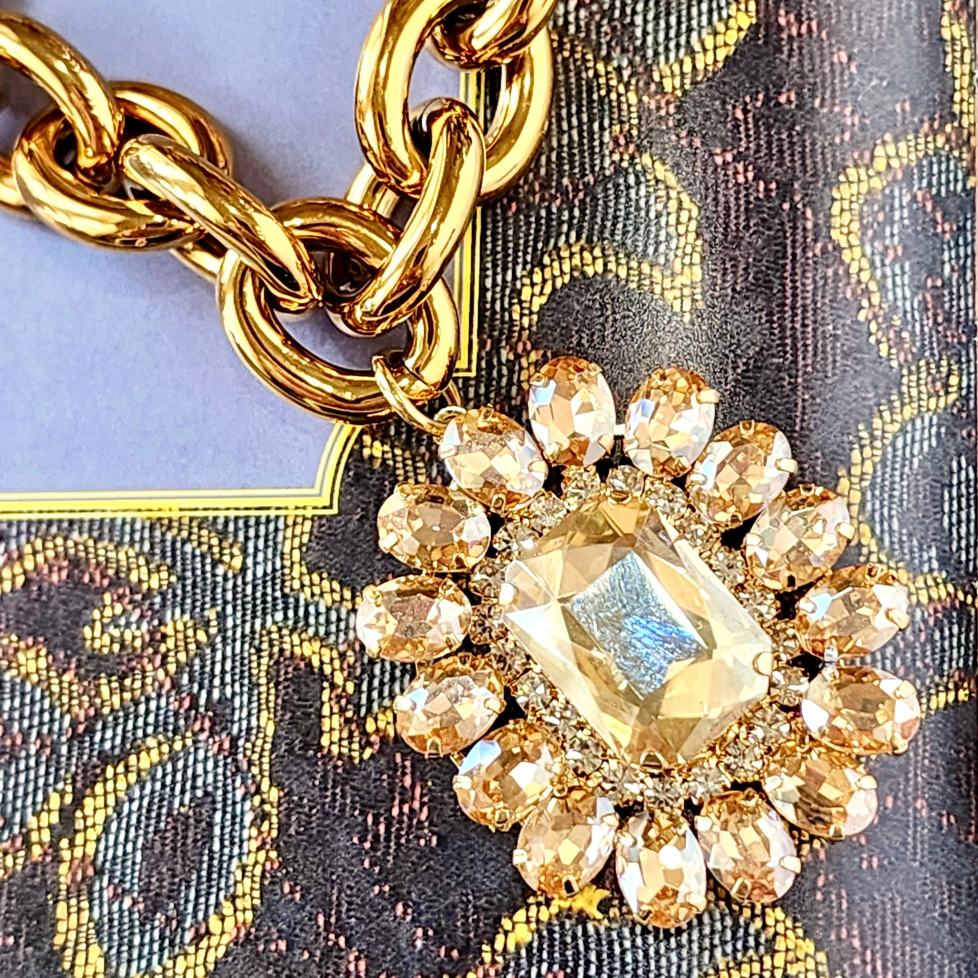 Bold, luminous, and undeniably luxe—Golden Heirloom is a statement built on shine and structure. A substantial gold PVD stainless steel chain sets the tone, anchored by a radiant pendant of faceted champagne crystals arranged in a vintage-inspired cluster.