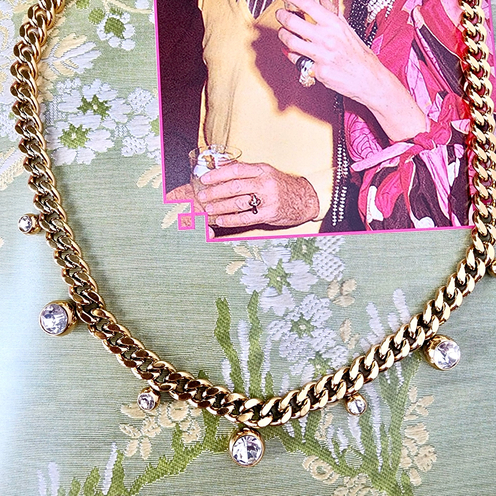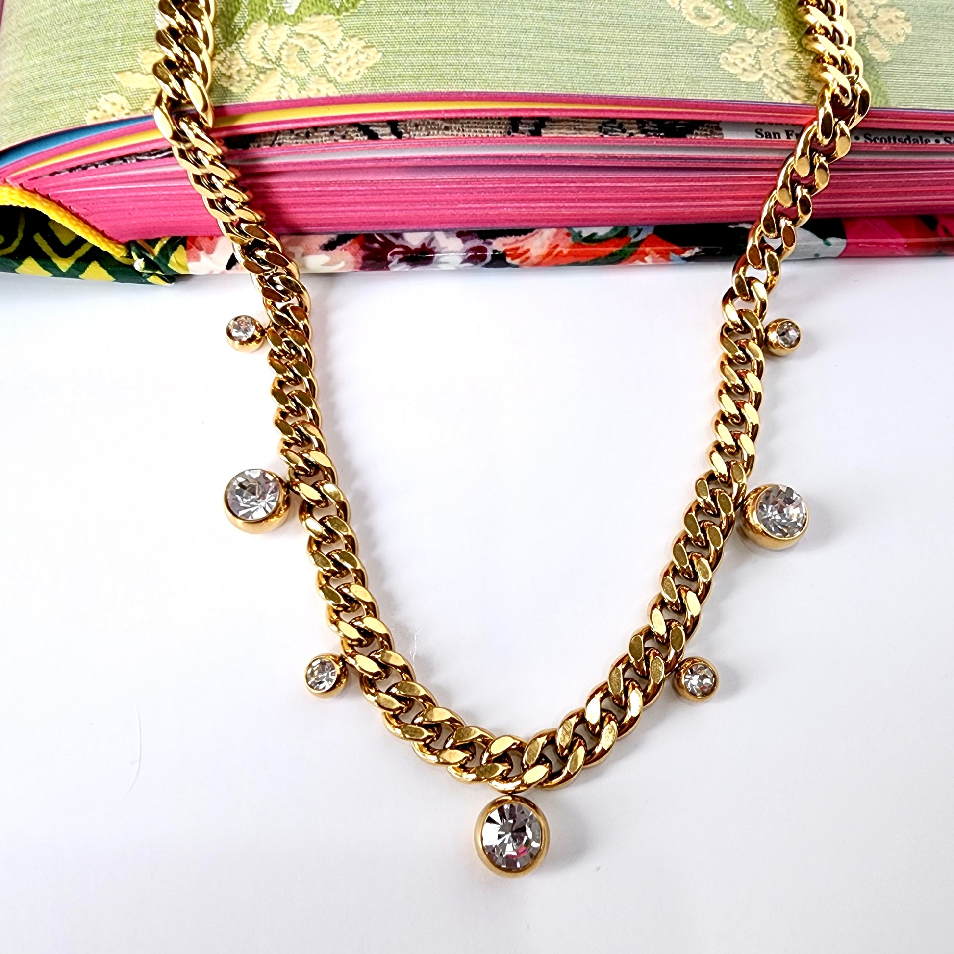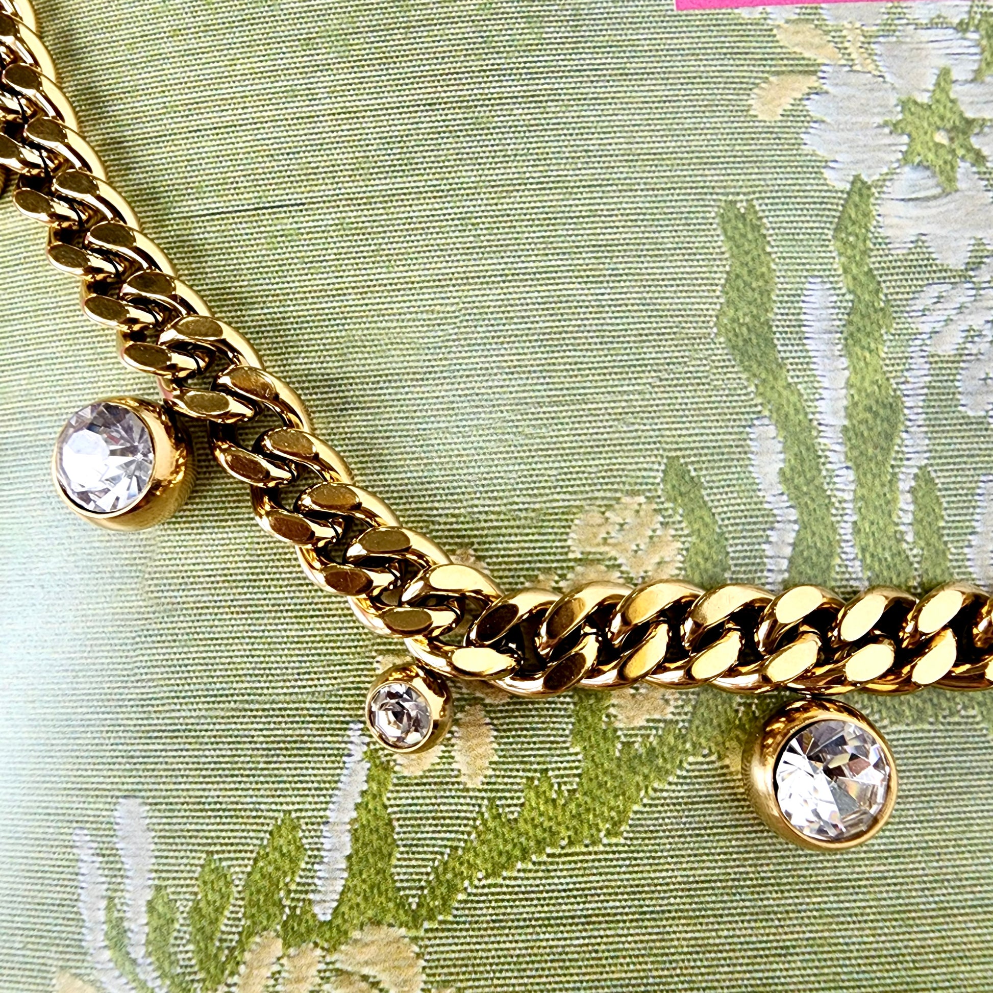 A bold curb chain softened with floating crystal drops—this piece balances edge and elegance effortlessly. Each bezel-set stone adds just the right amount of sparkle, creating movement and light without overwhelming the look.